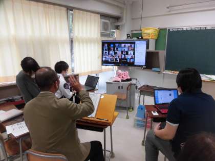 4学級で時間帯を区切ってミーティングルームを開き、子どもたちが時間の余裕をもって参加し、約15分間の学級活動を行いました。