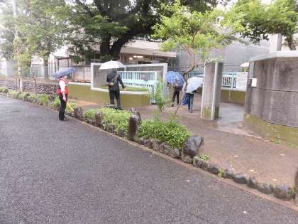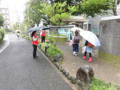 今朝の午前登校は、2年生Aグループの子どもたちです。子どもたちは傘を差して、保護者の方に見守られながら、教職員の声かけに元気なあいさつをしながら、登校してきました。登校時間には、世田谷警察署の方々が見守りと安全パトロールをしてくださいました。