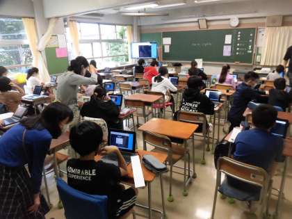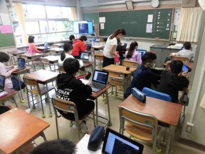2・3時間目には、既に取り組み始めている双方向型の学習システム「ロイロノート」の使い方を、タブレット型情報端末を一人ひとり操作して、みんなで学習しました。かなりの子どもたちが自宅で取り組んでいるようで、現在担任から出されている課題にも回答を提出いる子どももいるようです。
