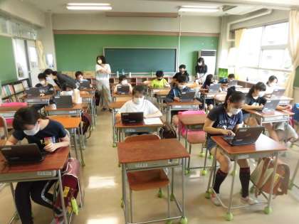仲間との簡単な情報交換も楽しみ、今後のロイロノートを使った双方向型での学習に意欲を見せている6年生のみなさんです。