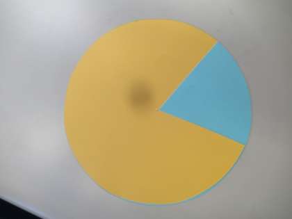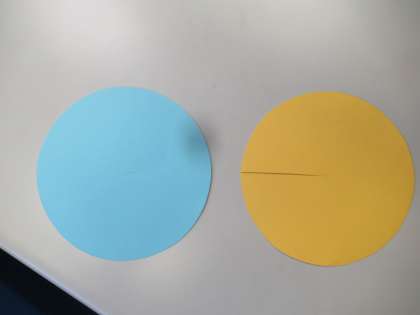 ○ 左の写真のように教科書ページ177ページのオレンジと青の円を切り取り線に沿って切ります。また中心に向かっている切り取り線も切ります。