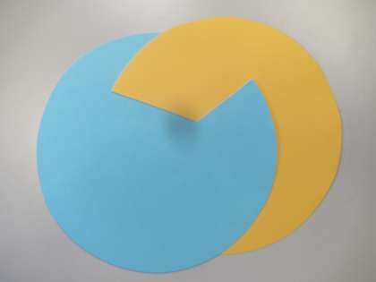 ○ 真ん中の写真のように二つの円の切りこみをはさむように円を重ねます。