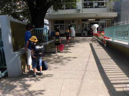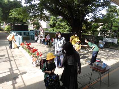 保護者の方と一緒に、または学校に登校することに慣れてきた子どもは一人で、朝日のまぶしい中、元気にあいさつをして登校してきました。ランドセルを背負って、黄色い帽子をかぶっての登校は、今日が初めてとなる子どもたちです。