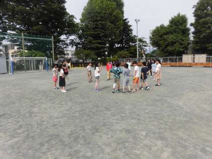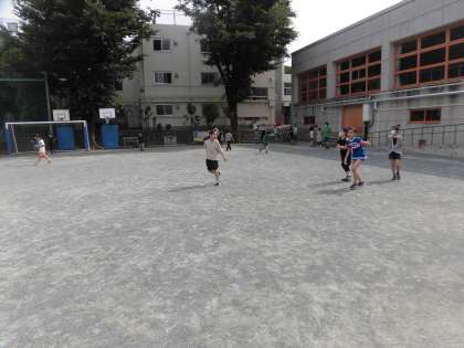 担任とともに校庭に出てきた4年生の子どもたちは、大勢の先生方に見守られながら、また、おしゃべりをしながら、学校でのひと時を過ごしていました。中には、ルールを工夫した鬼遊びを大勢で楽しみ、走り回るグループもありました。