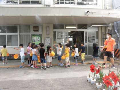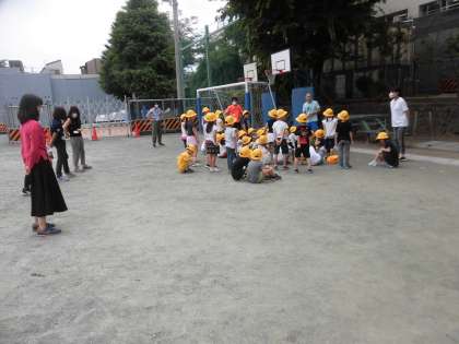 たくさん遊んで温まった体をクールダウンさせるため、休憩を取り、体育館にある大型扇風機の風にあたったり、昇降口の庇に設置してあるミストシャワーを浴びたりし、教室にもどって水分補給をしました。