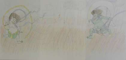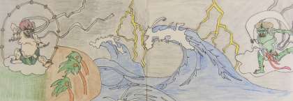 上の作品は風神雷神の表情から想像を広げ、下の作品は風神、雷神の特技から想像を広げて表しているんですね。
