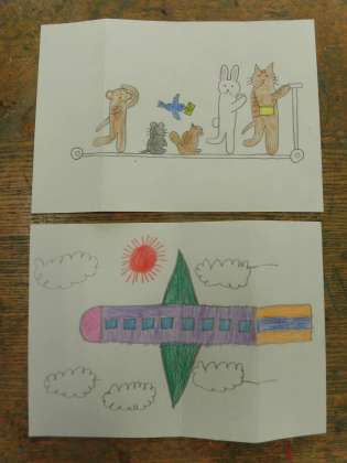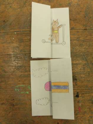 1人で乗っているキックボードに沢山の仲間が乗っていたり、消しゴムが飛行機に変身したり、伸びる仕組みを利用して大変身させていますね!