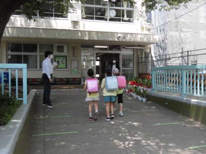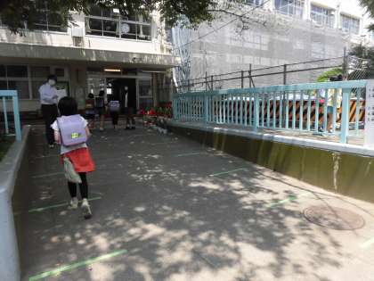 正門を入ったところで、専科の先生方が、健康観察カードの持参について確認し、必要に応じて健康観察カードと検温の指導を行っています。健康観察カードは、教室で記録した内容とともに担任の先生に提出し、確認をしています。
