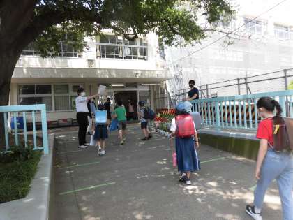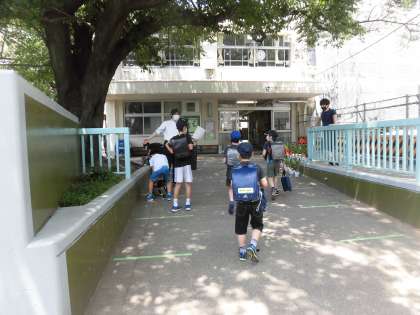 日中の気温がぐんぐんと上がり、強い陽射しが降り注ぎ、気温が30度を超える中、「こんにちは!」「おはようございます!」と遠くからもあいさつをして、元気に登校してきました。4年生と5年生は、工事区域を避けて昇降口まで行くため、仮設の通路を使いながら、北校舎をぐるっと約1周することになっています。最初は戸惑っている子どもたちでしたが、かなり慣れてきたようです。しばらくの間、不便をかけますが、よろしくお願いします。