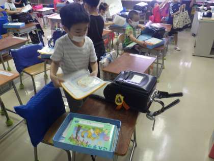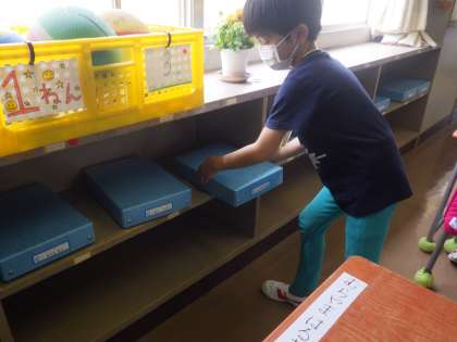 朝の支度で、ランドセルの用意が前よりも慣れてきました。1年生は、今日初めてお道具箱を持ってきました。「両手でしっかり出すんだよ。」と言われたことを、しっかり守って、丁寧に取り出すことができました。その結果、道具箱を落とす人が、全然いませんでした。道具箱の中を一つ一つ確認し、色鉛筆やクレパスなど、全部に記名してあるか、確認しました。道具箱の片付けも上手にできました。
