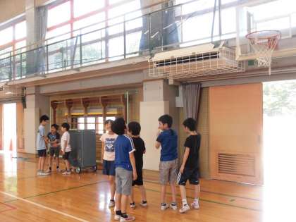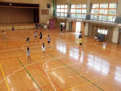 体育館や校庭での遊びや過ごす場所を選択して、20分間の休み時間を過ごしました。体育館では、冷房と大型送風機を作動させ、風や冷気を味わっている子どもたちや追いかけっこをしている子どもたちもいました。校庭では、日陰や短時間だけ校庭の中央に出て遊ぶ子どもたちもいました。