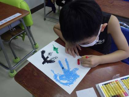 きのうと今日、1年生は道具箱の中にあるクレヨンを使って、海にいる生き物を描きました。