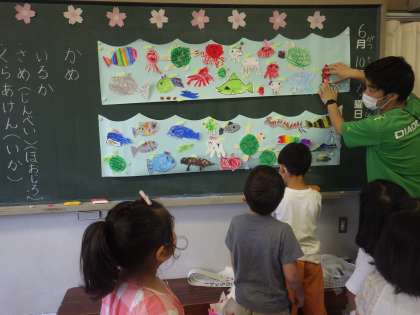 工夫して色を塗ったり、はさみで上手に切ったりして、生き物を水色の模造紙に貼り付けました!