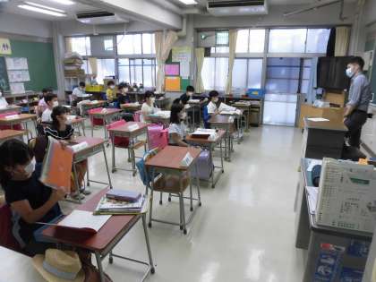 各教室で、まず出席の確認と健康観察カードと検温の確認を行いました。Aグループの子どもたちは、全員出席です。今日の学習の予定を確認したり、連絡事項を確認したりして、現在、1時間目の学習に取り組んでいる、分散登校3回目の子どもたちです。