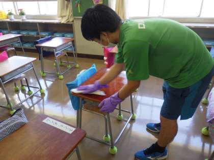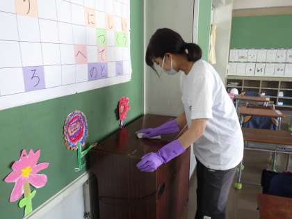 笹原小学校では、子どもたちが下校した後に、翌日の授業の備えてすぐに校舎内を消毒します。
