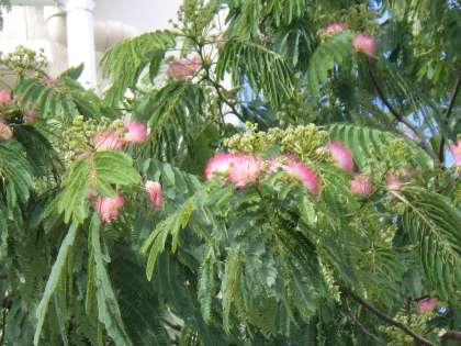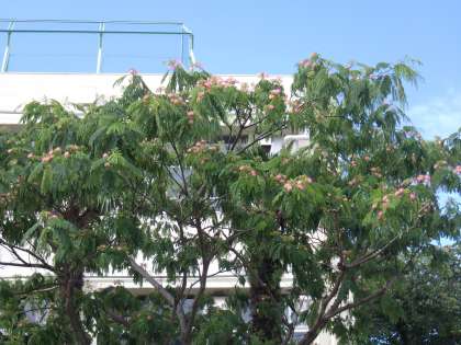 この木よく見ると、ピンク色の鳥の羽のような花が咲いています。