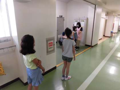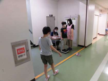 まずは校内でできる計測(身長・体重の測定)が、今日から始まりました。今週の分散登校期間を利用して、また、計測場所を工夫し、計測時間の短縮化を図りながら進められています。いつもは、保健室で行う計測ですが、今回は、計測する学級の近くに計測機器を運び、少しでも広い空間で実施しています。