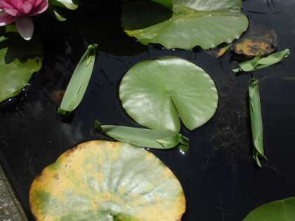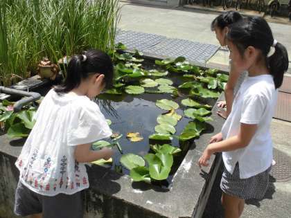 子どもたちは作り方を聞くと、思い思いの船を作り、水たまりや中庭の池に浮かべていました。水辺に遊ぶ涼しげな一枚が撮れました。