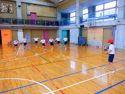 今回のめあては、「片足でより遠くにピタッと着地しよう」です。「だるまさんが転んだ」という遊びをケンケンで行い、より早くおににタッチするために「お腹に力を入れる」「着地の時に足を曲げる」など、より遠くに跳ぶためのこつを見つけ、自分の最高記録に挑戦しました。最後には全員が学習始めの時よりも遠くに跳ぶことができるようになりました。また1時間の締めくくりとして、「だるまさんが転んだ王決定戦」を行いました。子どもたち自身が見つけたこつを意識することで、初めて行った時よりも早くおににタッチすることができました。