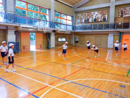 今日、4年2組では体育の学習で体つくり運動を行いました。学習内容は、「だるまさんが転んだ」と「片足ジャンプ」です。