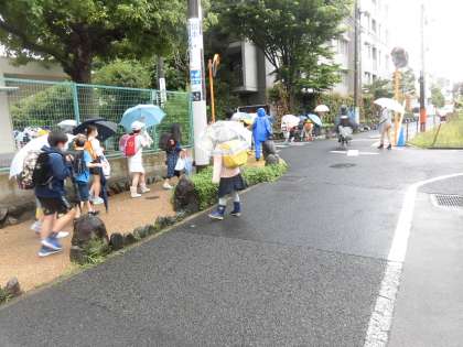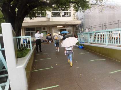 午前中は、雨が強く降る中でした。1年生にとっては、初めての傘を差しての登校となりましたが、昇降口前で上手に傘をまとめ、傘立てに入れ、昇降口に向かっていました。午後は、雨も弱まり、傘を持って登校する子どもたちがたくさんいました。