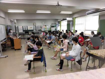 音楽室では机を使っていませんが、座る椅子の間隔をとり、歌唱教材も教科書の楽譜を見てイメージしたり、担任が用意したCDを聴きながら心の中で歌ったりしています。また、学習カードを工夫して、考えたことや感じたことを記入して学習を進めています。