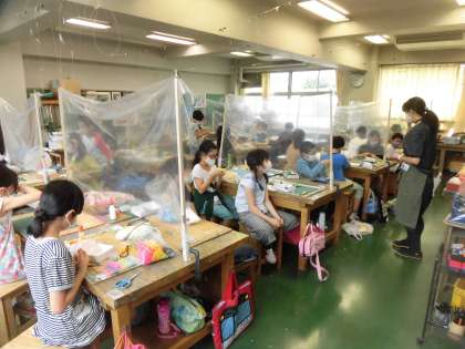 通常の教室や算数学習室では、世田谷区から配布された材料を使って製作したパーテーションを使っていますが、音楽室や図工室でも、学習形態や方法を工夫して授業を行っています。