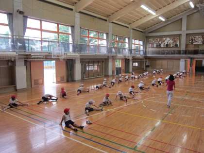 体育では、じっくりストレッチをして自分の身体と向き合ってから、いろいろな走り方を取り入れた走の運動を行いました。休業期間にたくさん練習し、縄跳びが上手になった子もたくさんいますよ!
