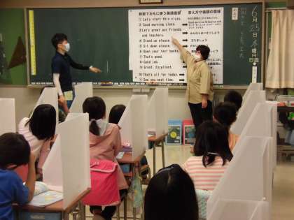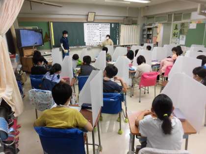 今日の2時間目には4年2組で、担任がT1、ALTがT2となり、今日の学習のテーマ「Hello!」で、テンポよく学習が進んでいました。