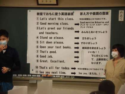 最初の学習なので、これからの学習活動で教室でおもに使う表現と、その答え方や表現の意味について、3年生までの学習を振り返りながら1つ1つ確認しながら、4年生としての学習がスタートしました。