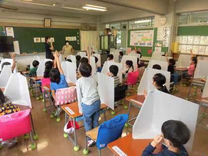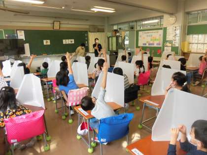 世田谷区では、小学校1・2年生が年間10時間の英語活動の学習に取り組むことになています。今年度は、臨時休業期間があったため、担任がT1でALTがT2として受け持つ授業が8時間、担任が受け持つ授業が2時間で計画しています。