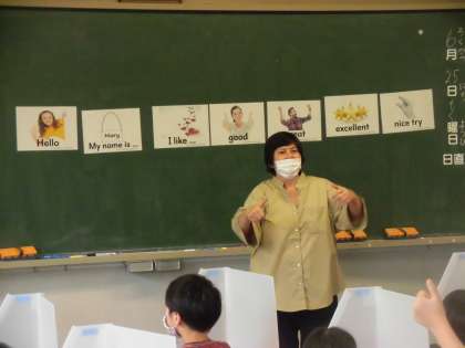 今日の4時間目には、1年2組で授業が行われました。子どもたちは、ALTの発音を真似て繰り返したり、黒板に提示されたカードを当てたりしながら、あいさつ・好きなもの・相手をほめる表現など、ジェスチャーを交えながら、楽しく学習に取り組んでいました。