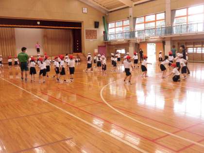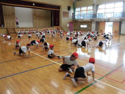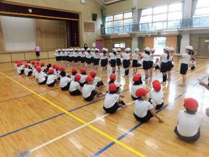 まず、集団行動について学習しました。並び方(整列の仕方)、「気を付け」「前へ、ならえ」「なおれ」「休め」などの動き、そして体育座りの姿勢など、今までに習った子どももいることと思いますが、全員で1つ1つ確認しながら行動していました。学級ごとに行ったり、全体で行なったりすることで、互いに見合うこともでき、みんなで美しい姿を見せていました。