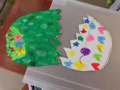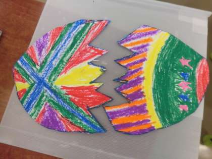 大きな卵の模様をクレパスで自由に描き、「ぎゅうぎゅうぬり」で隙間なく塗りつぶします。今日は、卵をぎざぎざに切って、中からどんな生き物が生まれてくるかを考えています。みんながわっと驚くような、素敵な生き物にしようと、先生のアドバイスをもとに一生懸命考えていました。