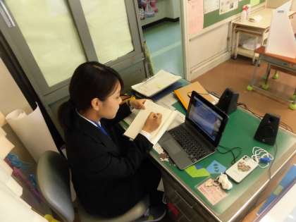 今日の午後3時15分から30分間、初任者研修対象教員のオンライン・ミーティングが、Zoom会議システムを使って行われました。本校からは1年2組担任の田渕翠教諭が参加しました。