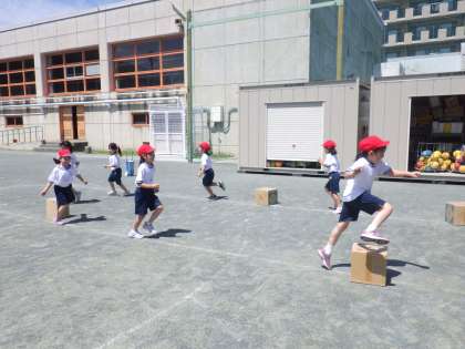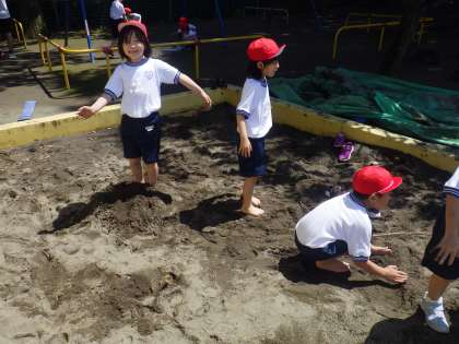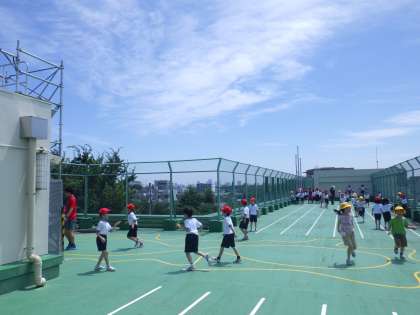 1年生はこの晴れ間を逃すまいと、体育の時間に思いっきり校庭で走ったり、砂場ではだしになって遊んだり、休み時間に屋上で過ごしたりしました。