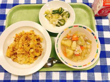 今日の給食には、いろいろな食材が入っていますね。野菜はにんじん、たまねぎ、キャベツ、きゅうり…。お肉は豚肉、ベーコン、ウィンナー…。そのほかにも、いもやきのこなど盛りだくさんです。いろいろな食べ物を食べると、栄養のバランスがよくなるので好き嫌いせず、いろいろな食べ物を食べてみましょう。