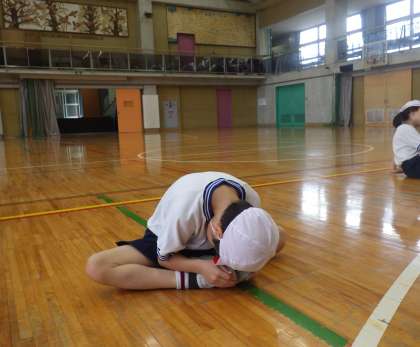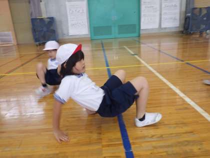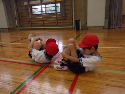 先生の指示をよく聞いて、「だるまさんのかっこうで転がる」「クモのように手を後ろについて動く」「だるまさんのかっこうで、頭を足に付ける」などなど、体と心をほぐしながら楽しく運動をすることができました。