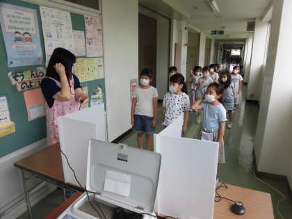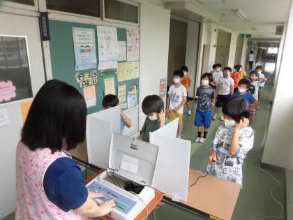 2年生の教室のある同じフロアの教育相談室前で、検査の仕方の説明を聞き、順番に検査を受けています。