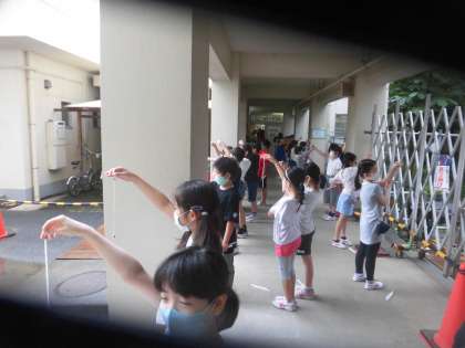 子どもたちが楽しそうに見ているのは、温度計です。ソーシャルディスタンスに気を付けながら1日の天気と気温の変化を調べている姿です。気温を正確に測るために温度計を目の高さに掲げてみています。