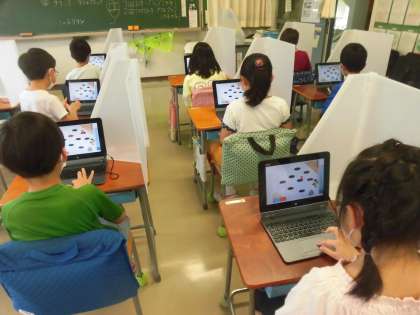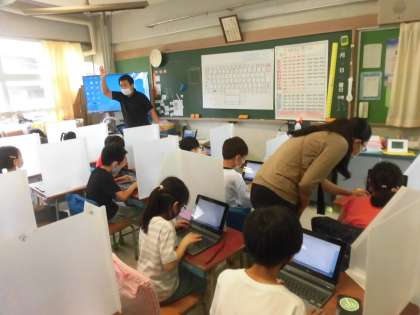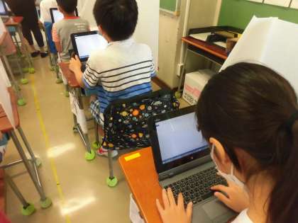 総合的な学習の時間「タブレットに親しもう」の学習では、起動、クリック、ダブルクリック、ドラッグの仕方を学習しました。その後、ローマ字打ちに挑戦しました。今日は、ICT支援員の方にも教室に入ってもらいました。子どもたちは集中して学習し、「えっ、もう時間。」「もっとやりたかった。」という声が聞こえました。