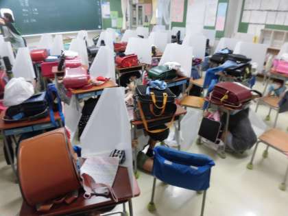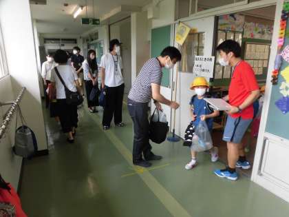 11時に大きな地震が発生したことを想定し、身を守るための行動をとる訓練をしました。人員と安全を確認した後、分散登校時のAグループとBグループで時間帯を分けて、保護者や引き取り人名簿に登載された引き取り人による引き取りを行いました。