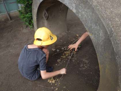 1年生は校庭の奥にある林の中で楽しく遊んでいます。