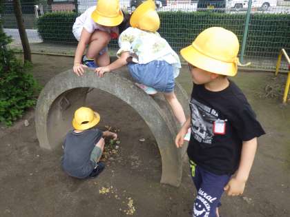 この一角に、土管を半分埋め込んだような不思議な遊び場があります。