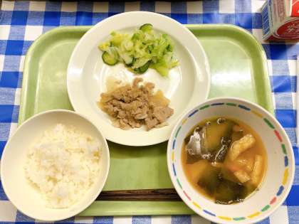 おなじみのスタミナ料理、しょうが焼きが給食に登場しました。豚肉は夏バテを予防してくれます。おいしくてごはんが進むの、もりもり食べられますね。