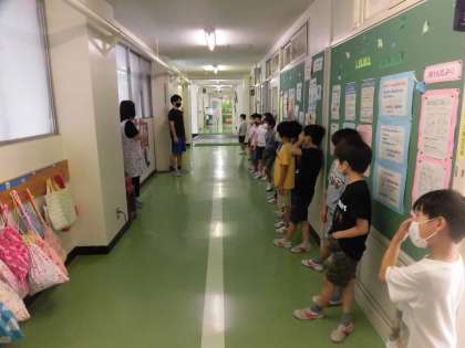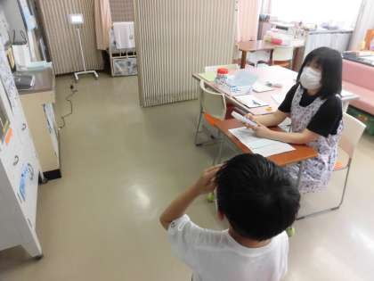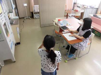 1時間目、3・4時間目を使って、保健室で検査を行っています。検査の仕方についての説明を受け、順序よく検査を受けています。