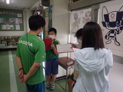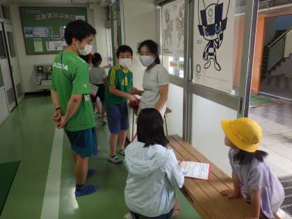 自分の担任の先生が、急に6年生に話しかけられている姿を見て、1年生も興味津々です。(黄色い帽子)