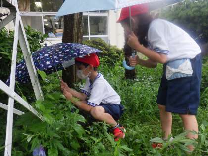 今日は雨が降っていましたが寒くなかったので、傘をさして中庭に「たんけん」に行きました。