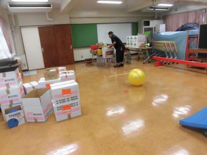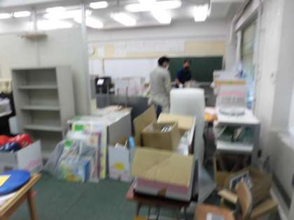 今日からは、現在の目の教室(1階と2階プレイルーム)を図書館として使用するための改修工事を開始するため、荷物の梱包作業を引越業者によって行いました。同時に、隣りの教育相談室も、現在のPTA室に移転するための引越作業の準備を行いました。