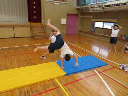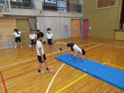 友達の練習する姿をじっと見て、「手をマットにしっかり着くようにするといいよ。」「足がピンと伸びていてきれいだね。」など、アドバイスしたり、よいところを褒めたりしながら、みんなで取り組んでいました。